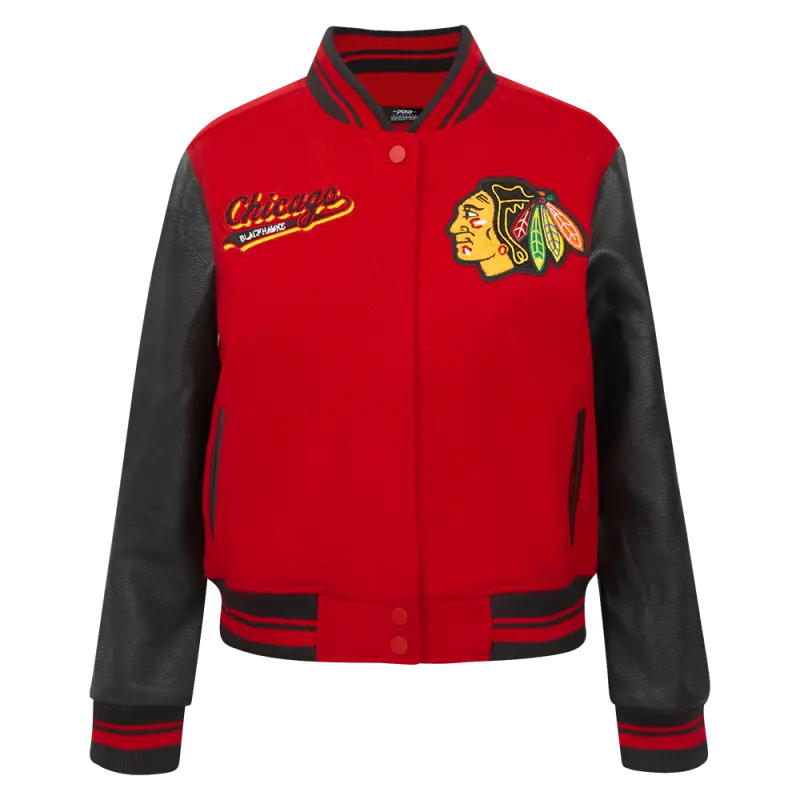 NHL CHICAGO BLACKHAWKS SCRIPT TAIL WOMEN’S WOOL VARSITY JACKET (RED\/BLACK)