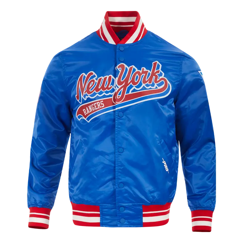 NHL NEW YORK RANGERS SCRIPT TAIL MEN’S SATIN JACKET (ROYAL BLUE\/RED)