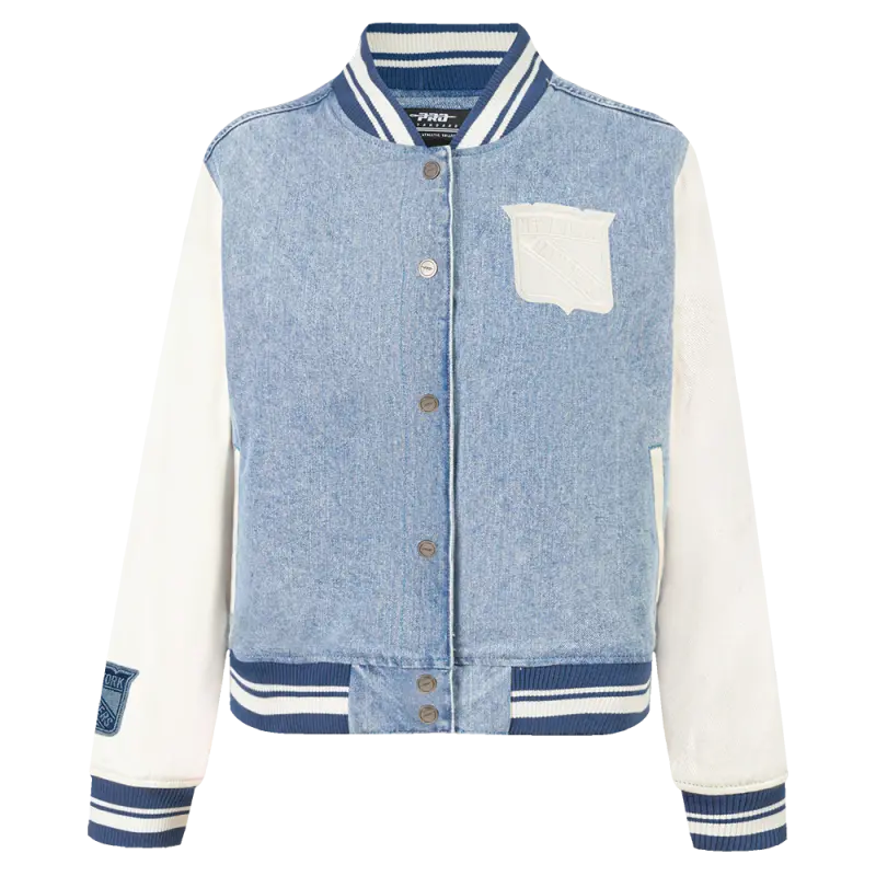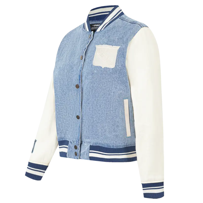 NHL NEW YORK RANGERS VARSITY BLUES WOMEN’S DENIM VARSITY JACKET (DENIM\/LINEN)